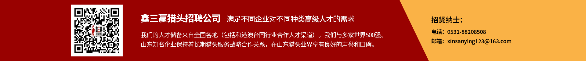 鑫三贏獵頭招聘公司(0531-88208508)是山東本土的知名專業獵頭招聘公司,幫助企業解決中高端招聘難題 ,免費幫助人才推薦更好的工作機會。公司總部位于山東省省會濟南市。我們致力服務于山東省內大中型內外資企業,我們通過對客戶企業的組織結構、相關業務和具體職位的研究、分析,能夠很好的與企業及候選人進行溝通,滿足不同企業對不同種類高級人才的需求,我們的人才儲備來自全國各地(包括和港澳臺同行業合作人才渠道)。我們與多家世界500強、山東知名企業保持著長期獵頭服務戰略合作關系,在山東獵頭業界享有良好的聲譽和口碑。